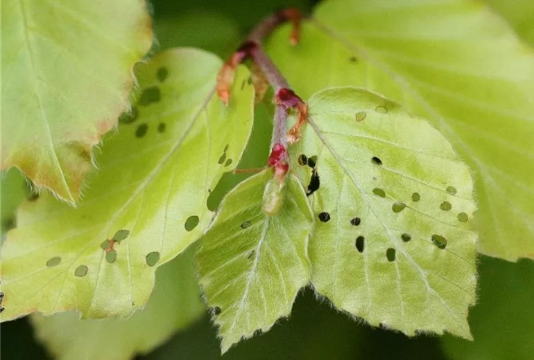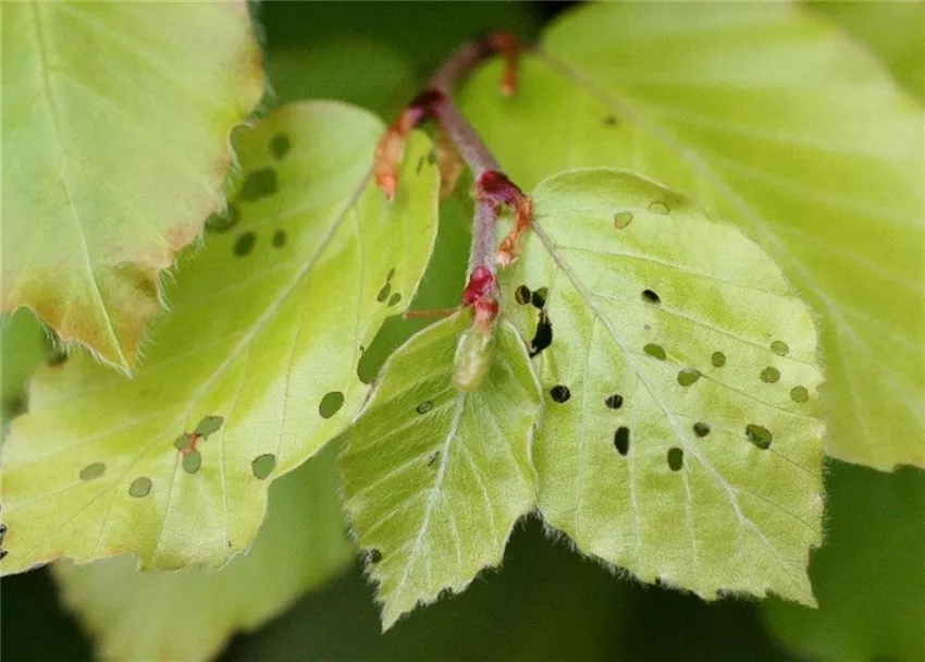 An den jungen Buchenblättern zeigt sich mit Beginn des Austriebs Lochfraß. Später sterben die Blattränder und manchmal auch weitere Blattpartien ab und färben sich braun.