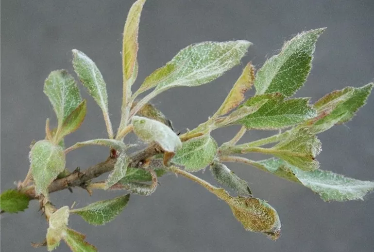 Im Mai und Juni sind die jungen Blätter und Triebe des Apfels, manchmal auch die der Quitte, ganz oder teilweise von einem weißen, mehlartigen Belag überzogen.