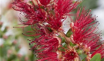Callistemon citrinus bildet während der gesamten Saison zahlreiche rote Blüten. Bei richtiger Pflege Nachblüte im Februar.