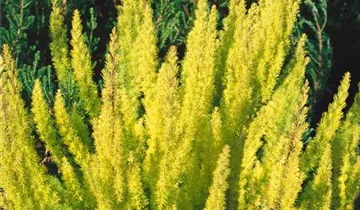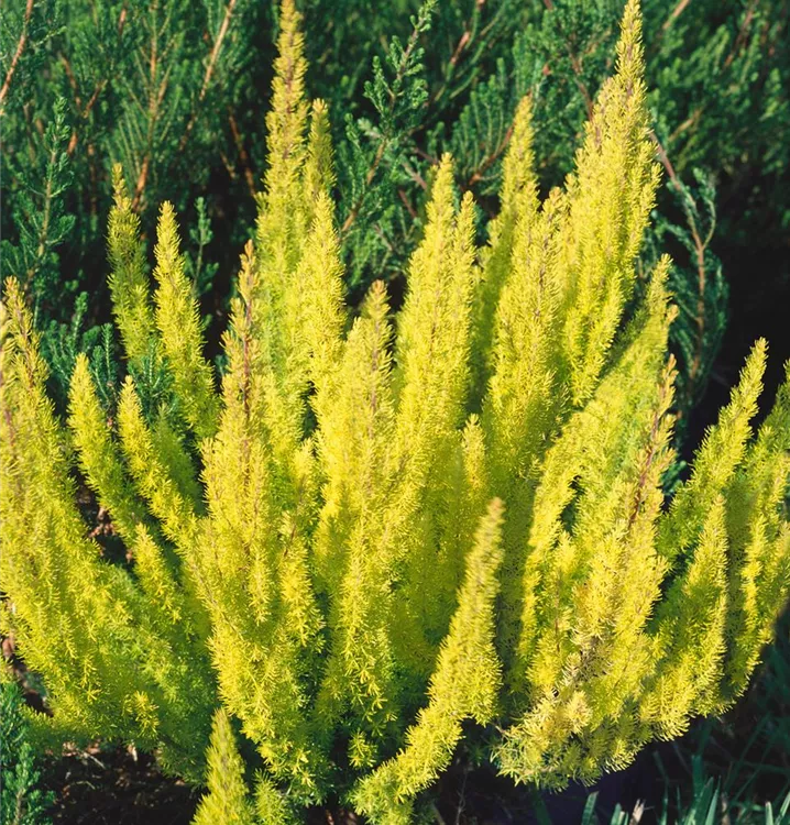 Die immergrünen Blätter der Baumheide sind gelb-grün, nadelförmig.