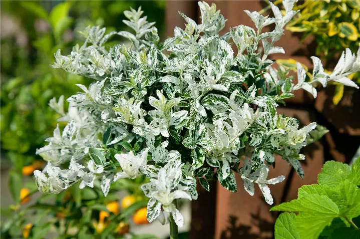 Die 5 cm bis 6 cm großen, rundlichen Blätter bilden ein immergrünes Laubwerk. Sie präsentieren sich in Weißbunt. Im Herbst färben sich die Blätter rot.